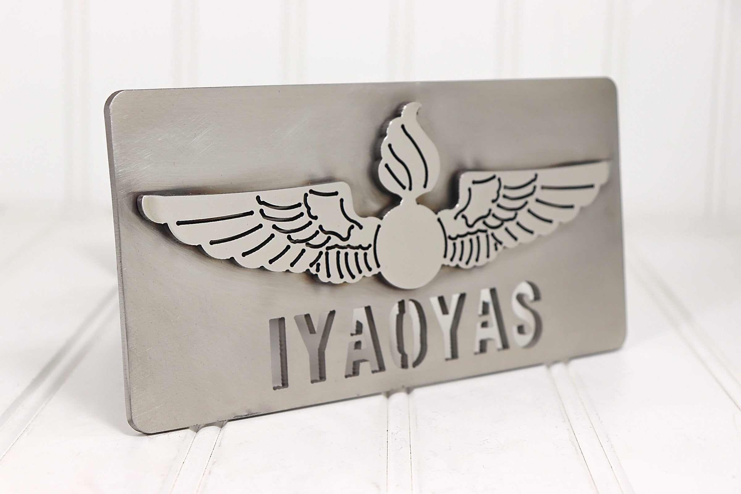 Two Piece Design. Rectangle has a brushed finish and Bomb and wings mirror finish.